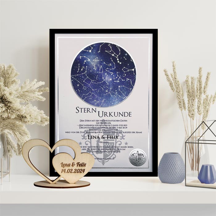 Die Sternurkunde ist das Herzstück der Sterntaufe: Sie dokumentiert ihren persönlichen Eintrag in das internationale S.A.I.-Sternregister®. Neben dem von Ihnen gewählten Sternnamen und dem Taufdatum sind auch die wissenschaftlichen Daten und Koordinaten Ihres Sterns auf der Urkunde angegeben. Optional können Sie Ihrer Sternurkunde auch eine persönliche Widmung hinzufügen – natürlich kostenlos.