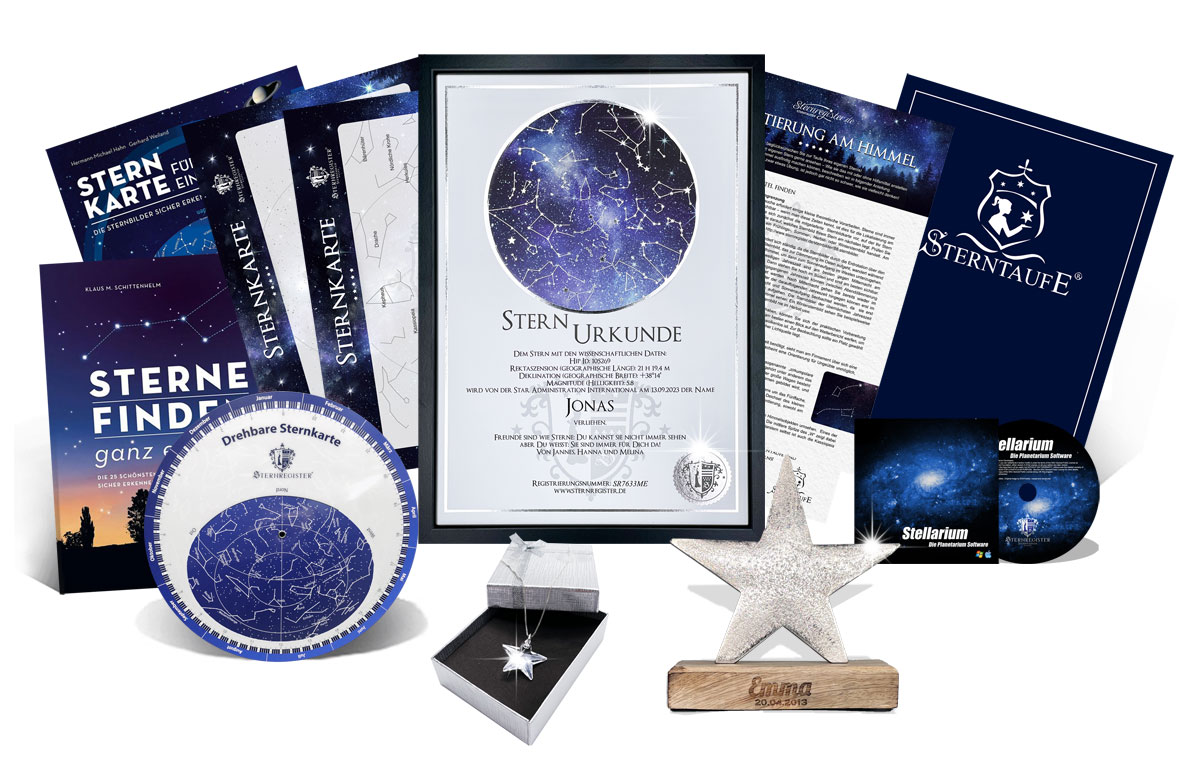 Jedes unserer Sterntaufepakete beinhaltet eine Grundausstattung, die aus der Sternurkunde, zwei Sternkarten zum Finden Ihres Täuflings am Nachthimmel und einer ausführlichen Anleitung besteht. Darüber hinaus bieten wir Ihnen viel tolles Zubehör an, das sie zu Ihrem Stern kaufen können: Neben der veredelten Sternurkunde erfreuen sich hier z.B. auch unsere Trophäen zur Sterntaufe großer Beliebtheit. Des Weiteren bieten wir Ihnen auch die Rahmung der Sternurkunde und den Besatz Ihrer Urkunde mit Swarovski-Kristallen an. Hier erhalten Sie einen Überblick über unser aktuelles Zubehör zur Sterntaufe.