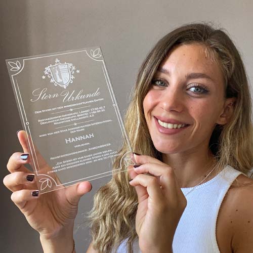 Wenn Sie einen Stern kaufen und verschenken ist das etwas Einzigartiges – mit unserem großen Zubehör-Sortiment können Sie Ihre Sterntaufe noch individueller gestalten! Machen Sie Ihren Stern mit einer unserer individualisierten Sterntaufen-Trophäen tatsächlich greifbar, lassen Sie Ihre Urkunde mit Swarovski-Steinen veredeln oder verschenken Sie ein edles Schmuckstück zusammen mit Ihrer Sterntaufe: Die Möglichkeiten sind unbegrenzt!